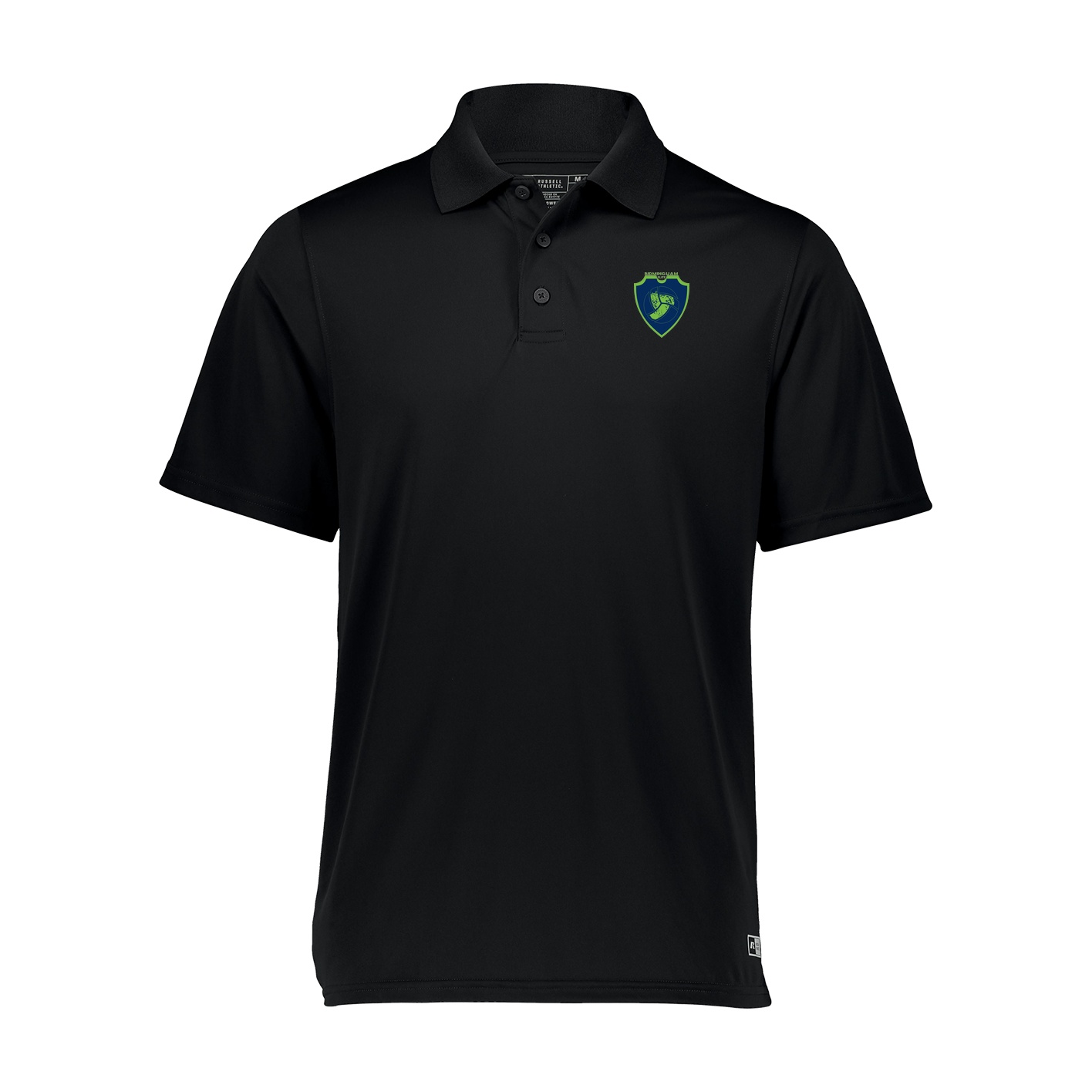 - 4.0 ounce 100% polyester. Dri-Power Moisture Wicking Technology. Odor protection. Tagless label. RUSSELL ATHLETIC heat sealed label on bottom left front. Ribbed collar. Three-button placket. UPF 30+, provides protection from the sun. Set-in sleeves